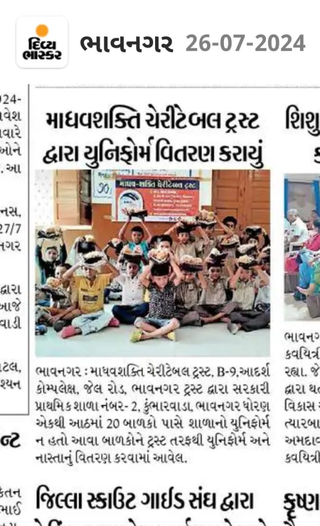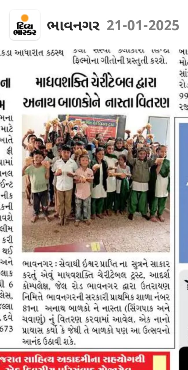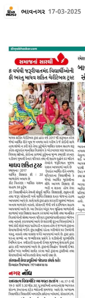 ટ્રસ્ટ દ્વારા અંકુર મંદબુદ્ધિ ના બાળકોની શાળા માં 5 બાળકોને તેમની વાર્ષિક વાહન ફી માં સહાય - દિવ્ય ભાસ્કર (ભાવનગર આવૃત્તિ)